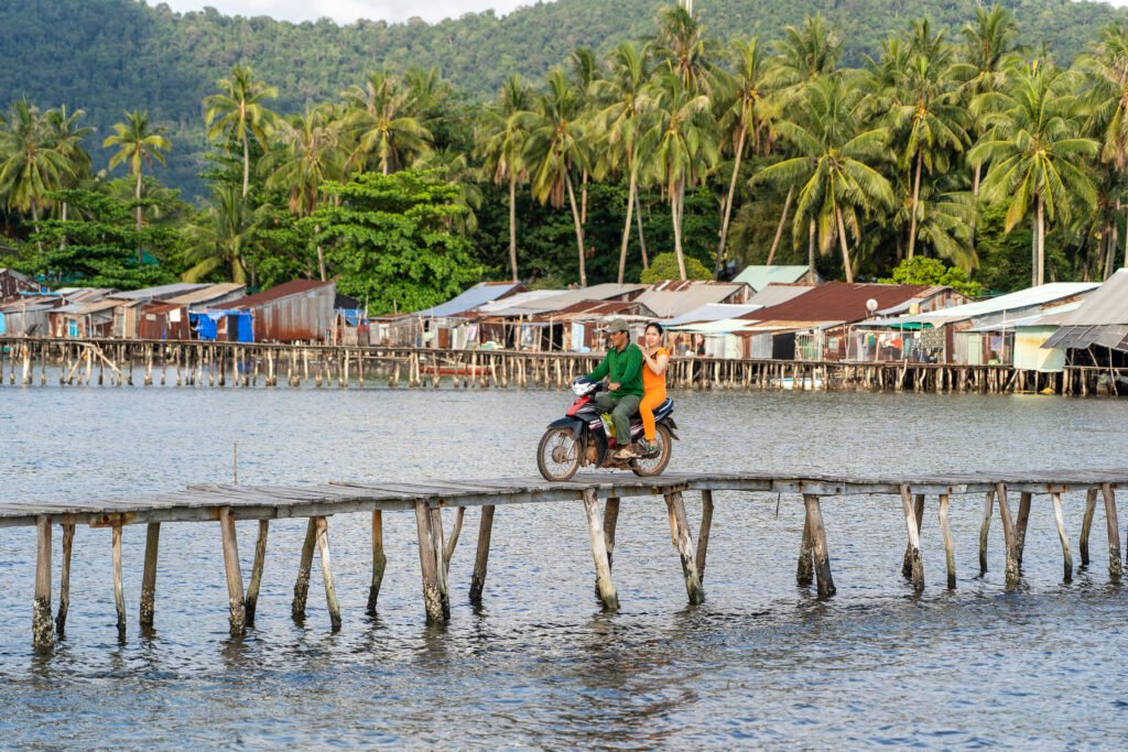 Phu Quoc island, Vietnam – may 05, 2020 : Vietnamese man and woman sitting on a motorbike ride on a narrow wooden bridge in a fishing village on Phu Quoc island, Vietnam