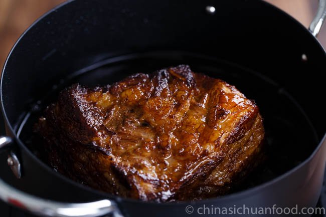 1. Boiling: The pork belly is first boiled to remove impurities and to tenderize the meat. This initial boiling helps in ensuring that the pork is clean and ready for further cooking.